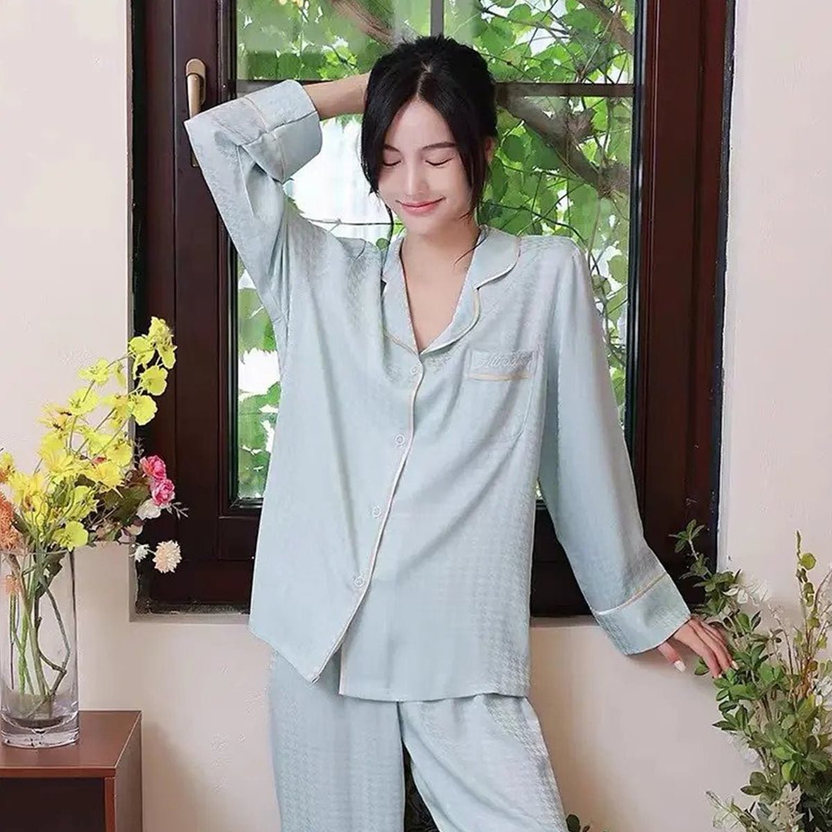 • A Symphony of Design: The set features a long sleeve top and trousers, each thoughtfully designed to create a harmonious blend of style and comfort. The long sleeves provide an extra layer of warmth, making these pajamas ideal for cooler nights or air-conditioned environments. The classic collar on the top adds a touch of refinement, while the trousers offer a relaxed fit with an elastic waistband that ensures a comfortable, secure feel.